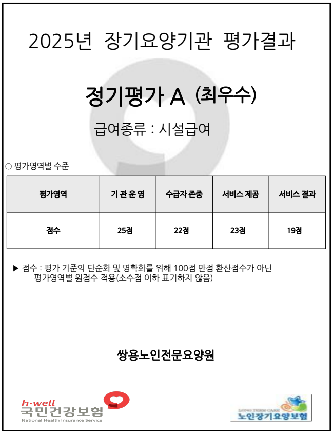 안녕하세요~ 2025년 장기요양기관평가 결과가 발표되었는데 쌍용노인전문요양원이 최우수 등급(A등급)을 받았습니다. 보호자께서 늘 애정어린 마음으로 협조 잘해주신 덕분이라 생각합니다. 앞으로 더 좋은 서비스로 어르신들의 행복한 하루하루가 되도록 노력하겠습니다. - 쌍용노인전문요양원 - |